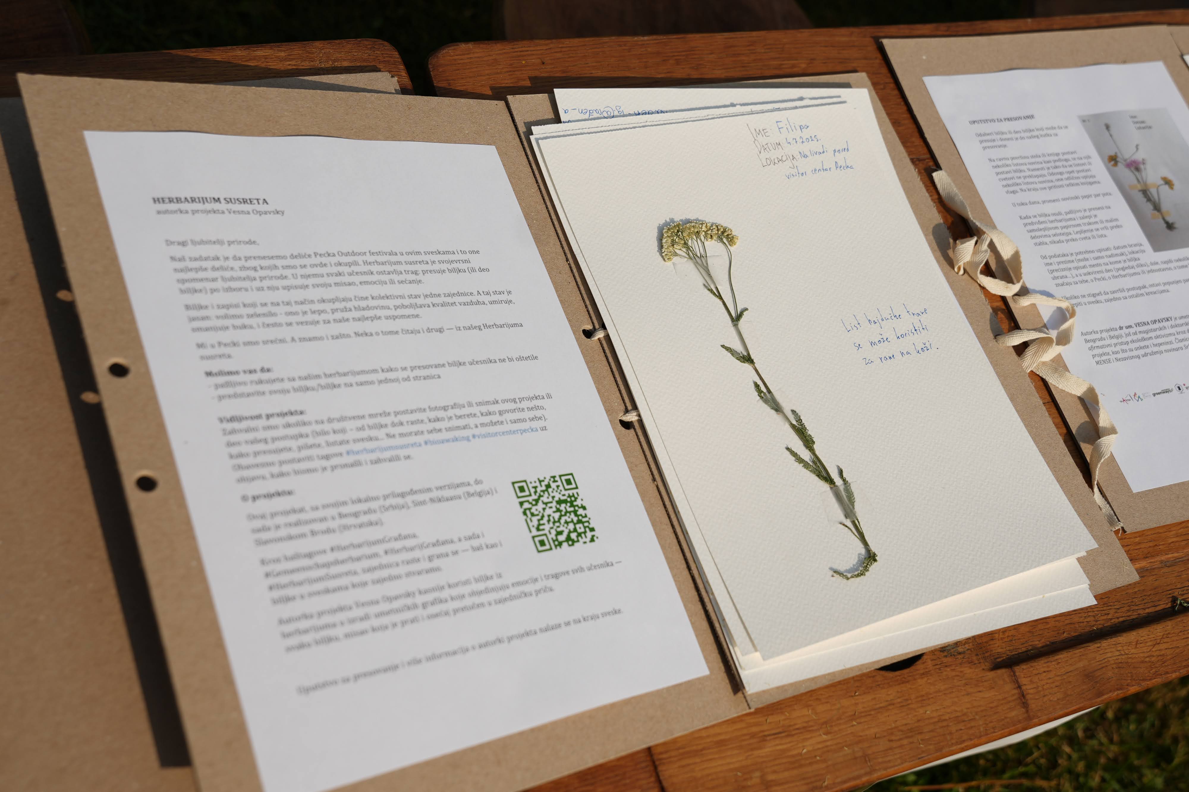 The herbarium of encounters is an artistic-ecological project by Vesna Opavsky, realized at the Pecka Outdoor Festival. Visitors choose a plant from nature, press it, and leave a trace in the shared notebook – the herbarium. Each plant and note become part of the collective memory and a shared message of love for nature. The digital records of these pressed leaves, as well as the artworks Vesna later creates from the collected plants, can be followed on social media through the hashtag #Herbarijumsusreta.