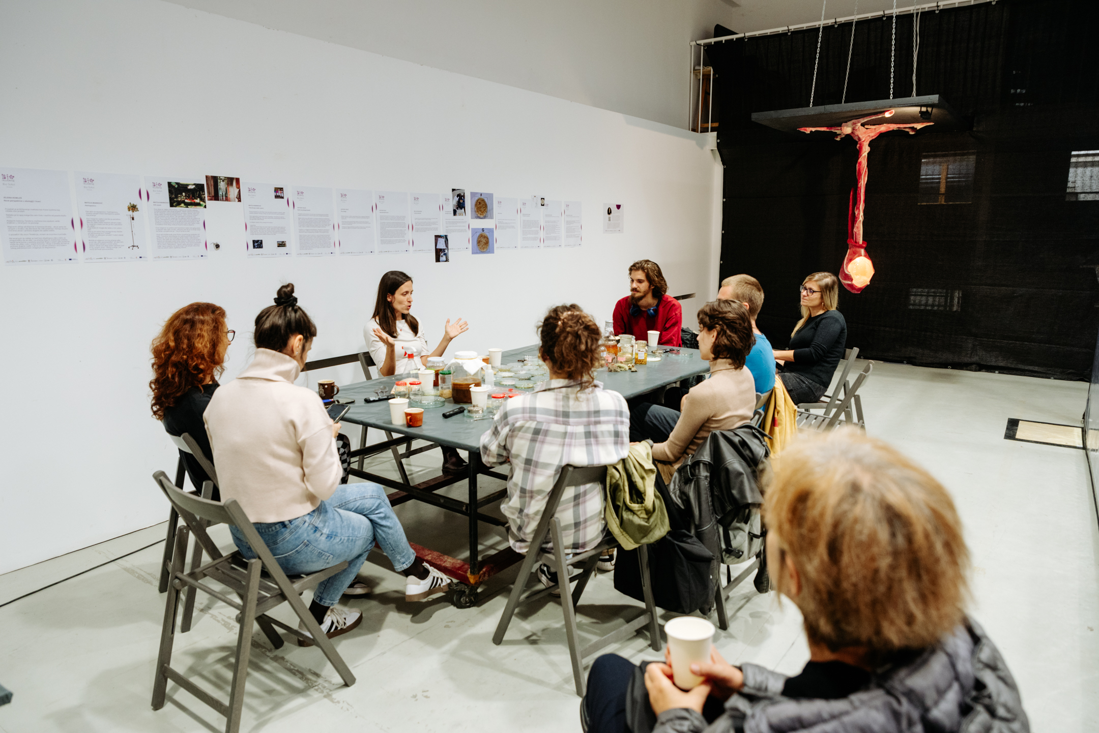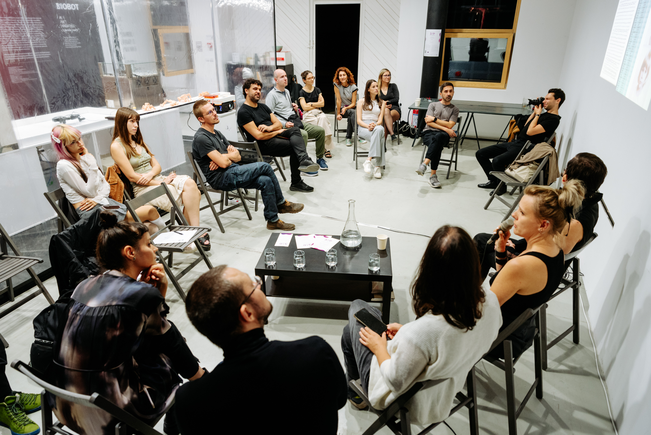 Okrugli sto sa umetnicima okuplja dinamičnu grupu kreatora koji rade na preseku umetnosti, nauke i tehnologije. Karolina Żyniewicz, umetnica, istraživač i edukatorka sa sedištem u Berlinu, poznata je po svom istraživačkom pristupu živim materijama i biotehnologiji u različitim kontekstima, pomerajući granice. Dr Margherita Pevere, umetnica i istraživač, izaziva društvene tabue kroz duboko razmatranje smrti, seksa i ranjivosti. Zoran Srdić Janežič, skulptor i intermedijalni umetnik iz Slovenije, inovira sa animatronikom i biotehnologijama, spajajući mehaničke i biološke elemente u svojim fascinantnim umetničkim delima. Adrienn Újházi, vizuelna umetnica, istražuje odnos između ljudi i prirode kroz različite medije, doprinoseći brojnim projektima i izložbama. Zajedno, ovi umetnici izazivaju razmišljanje, istražuju korišćenje biomaterijala kao medija i inspirišu dijalog na preseku umetnosti, nauke i tehnologije.