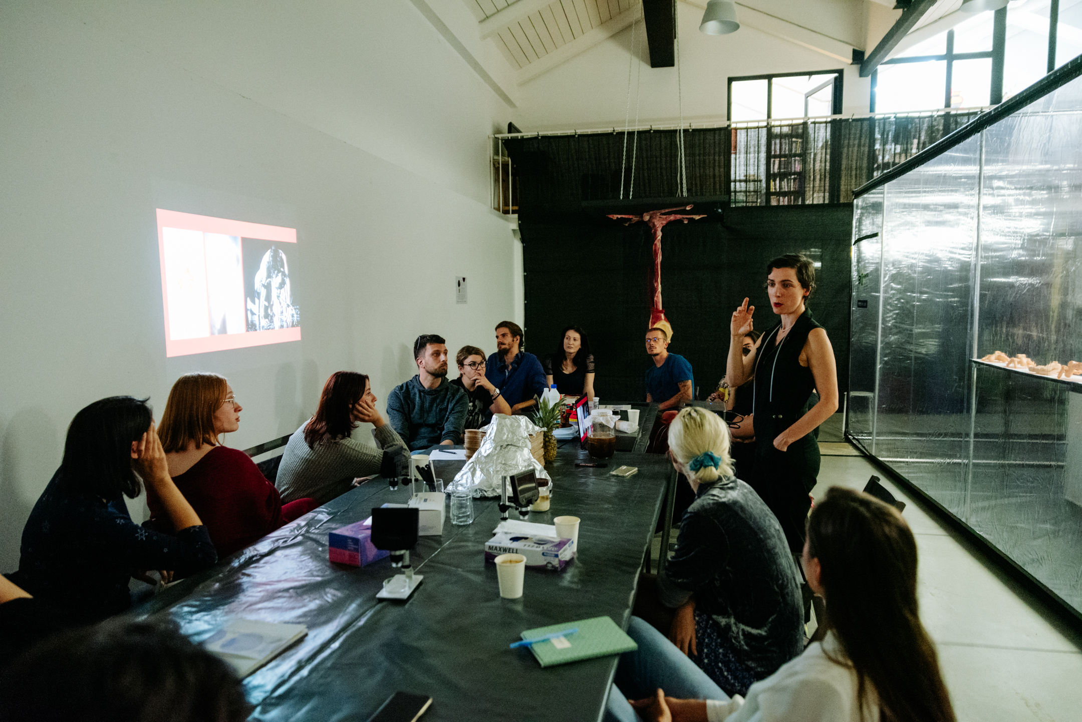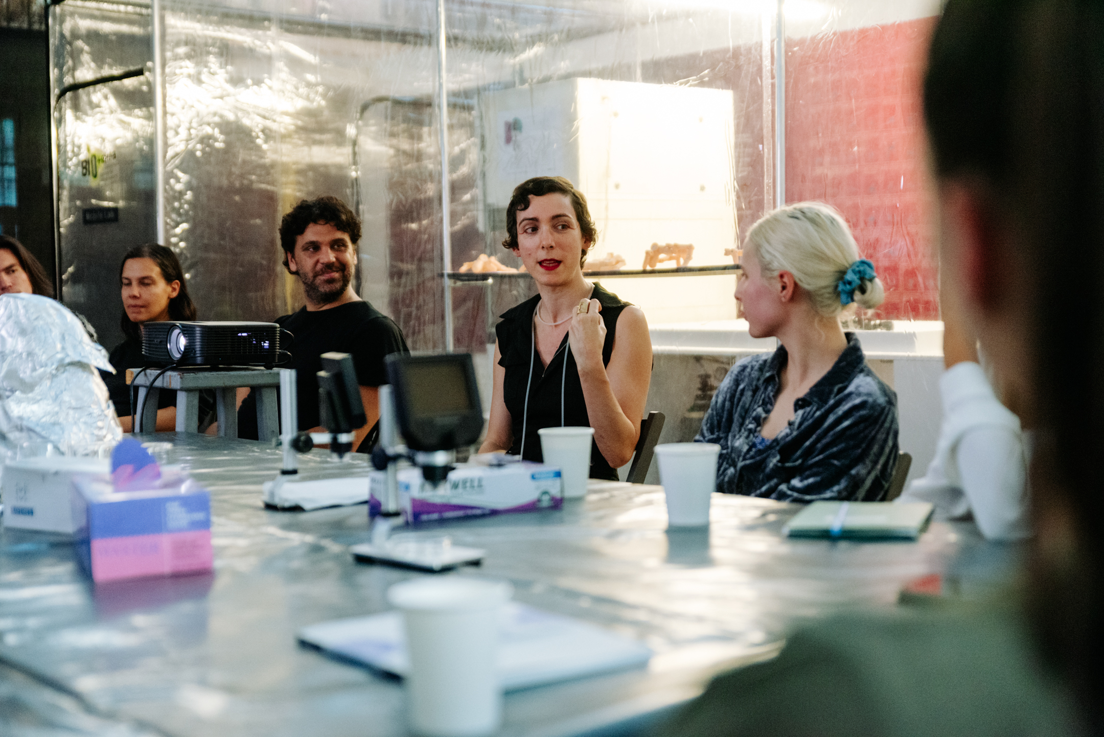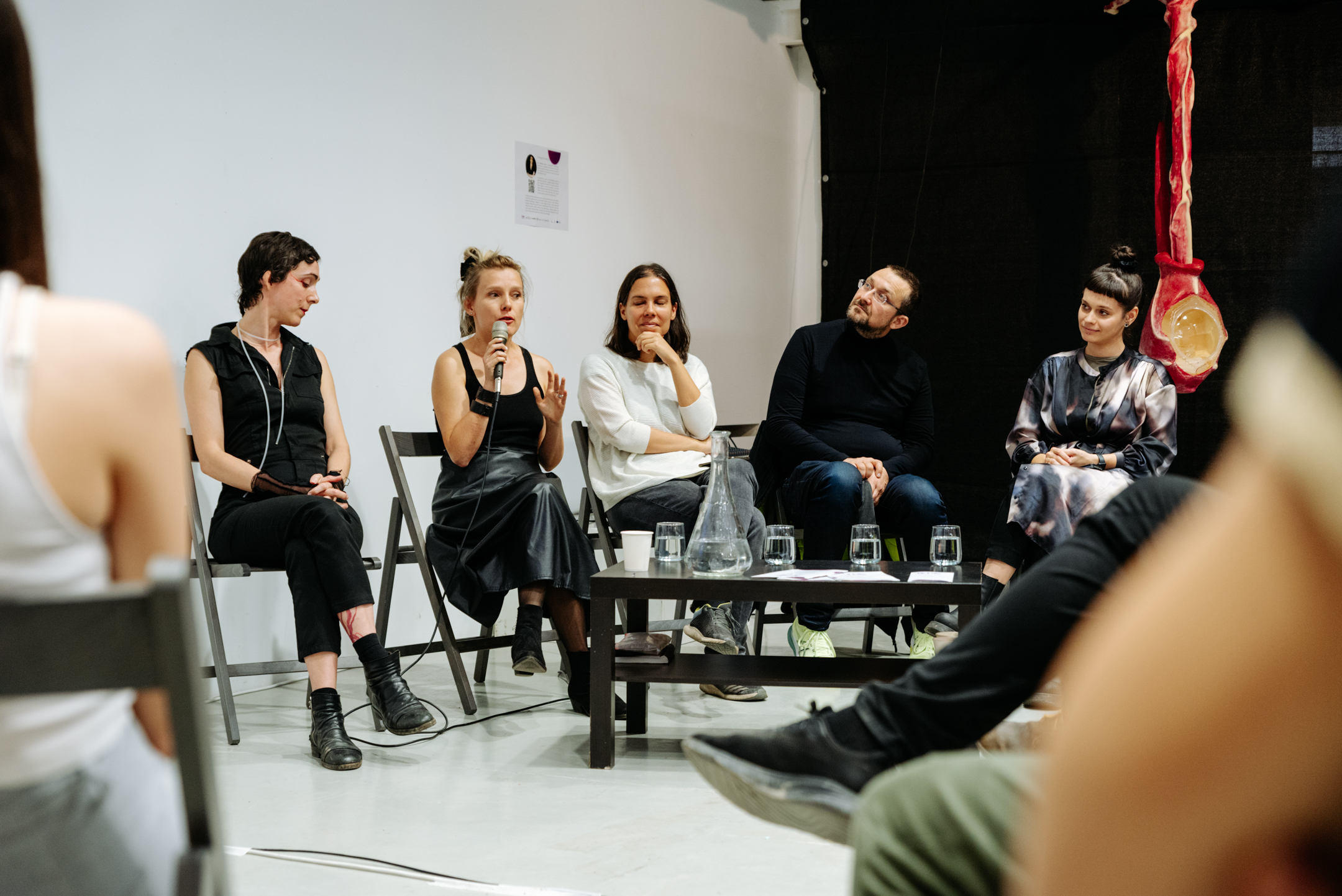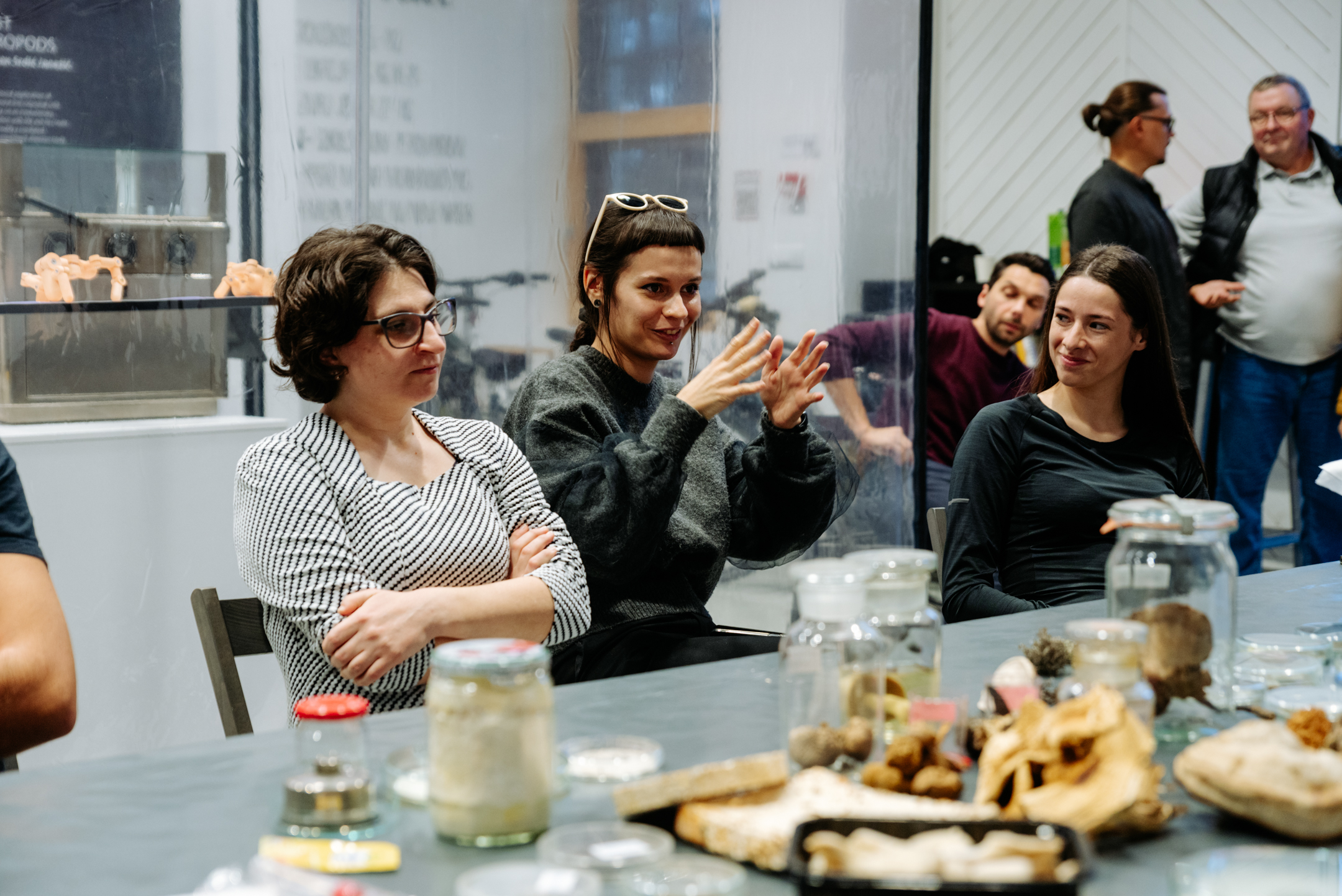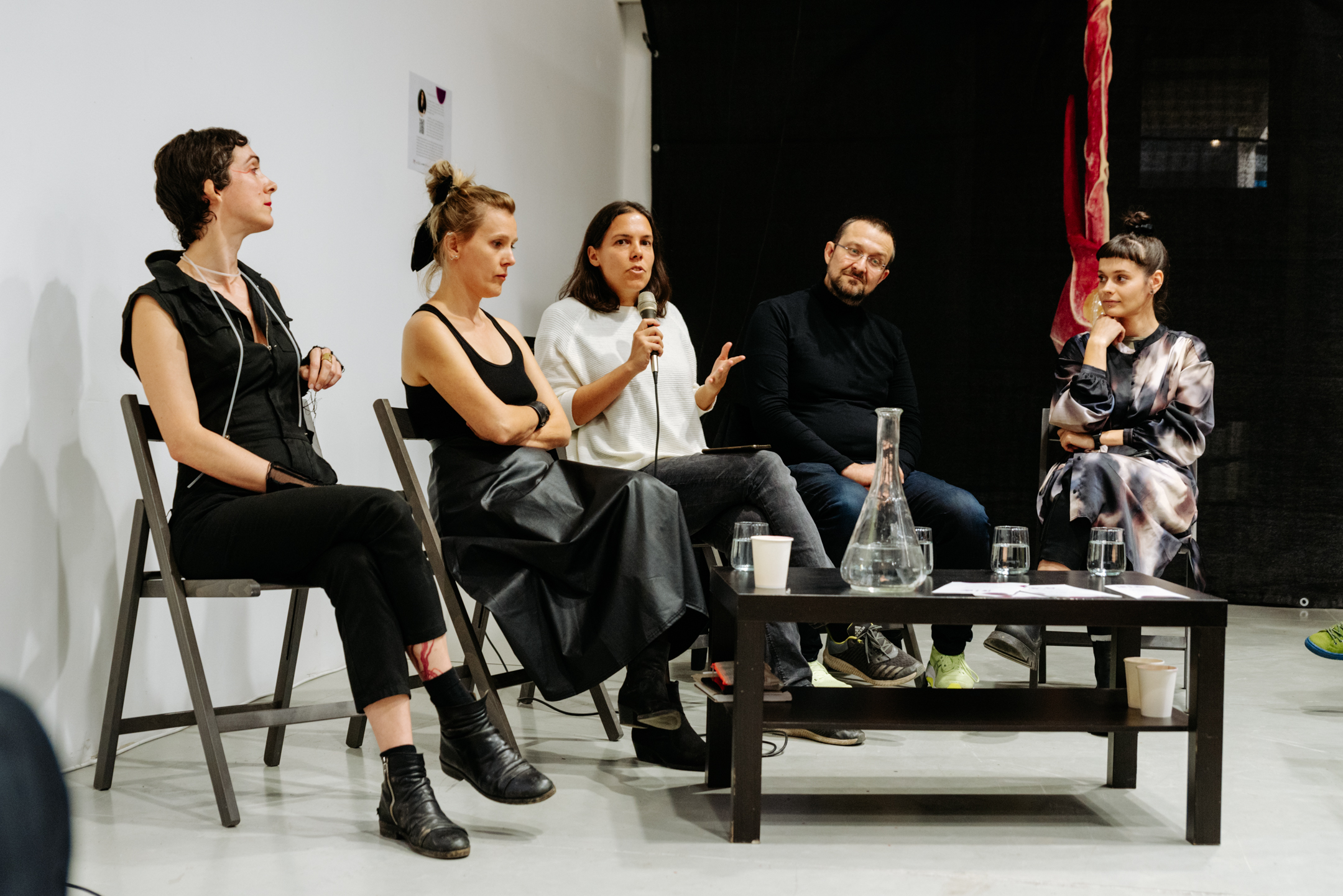 Okrugli sto sa učesnicima okuplja nove i etablirane praktičare koji deluju na preseku umetnosti, dizajna, nauke i tehnologije. Učesnici su: Maja Halilović (BH), biodizajnerka koja transformiše organski otpad u inovativne materijale; Phyllis Januel (FR), dizajnerka koja istražuje ruralnu održivost i prakse brige; Milica Rukavina (RS), biolog koji spaja mikrobiologiju i umetnički eksperiment; Mateja Marković (RS), umetnik novih medija koji istražuje bioetiku kroz istraživanja, intervjue i kritičku refleksiju o našem odnosu prema životu; i Nastja Ambrožič (SI), intermedijalna umetnica i edukatorka čija praksa spaja umetnost, ekologiju, biologiju i DIY tehnologiju. Diskusija otvara prostor za preispitivanje materijala, metoda i etike kreativne prakse u post-disciplinarnom svetu.